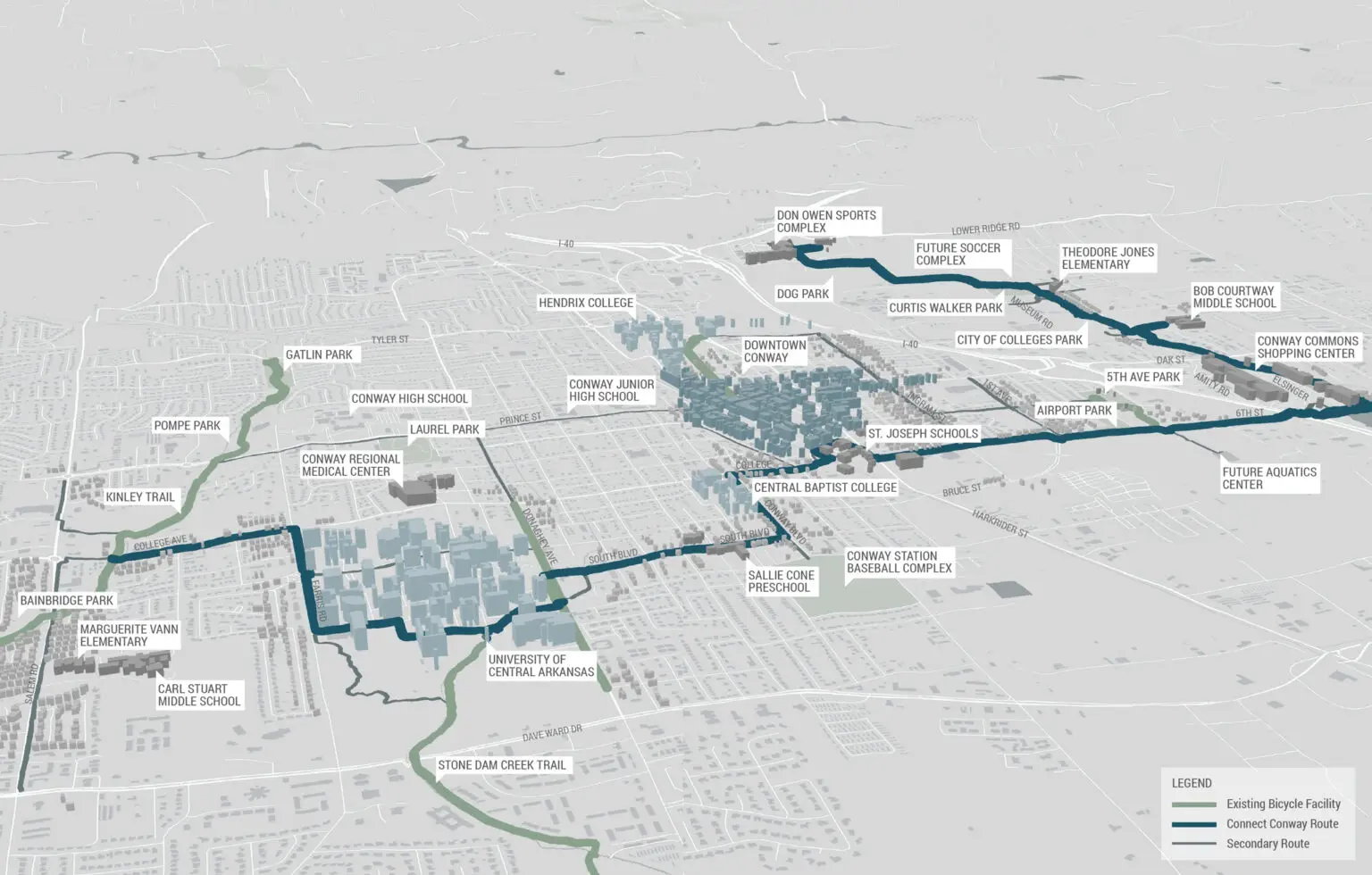 Connect Conway aims to build a safe, equitable, and accessible transportation system through investment in 15 miles of bike and pedestrian infrastructure, providing a viable transportation option for many by connecting ten city parks, seven schools, three major retail areas, three higher education institutions, fourteen major employment centers, sixteen neighborhoods, and other vital community services.